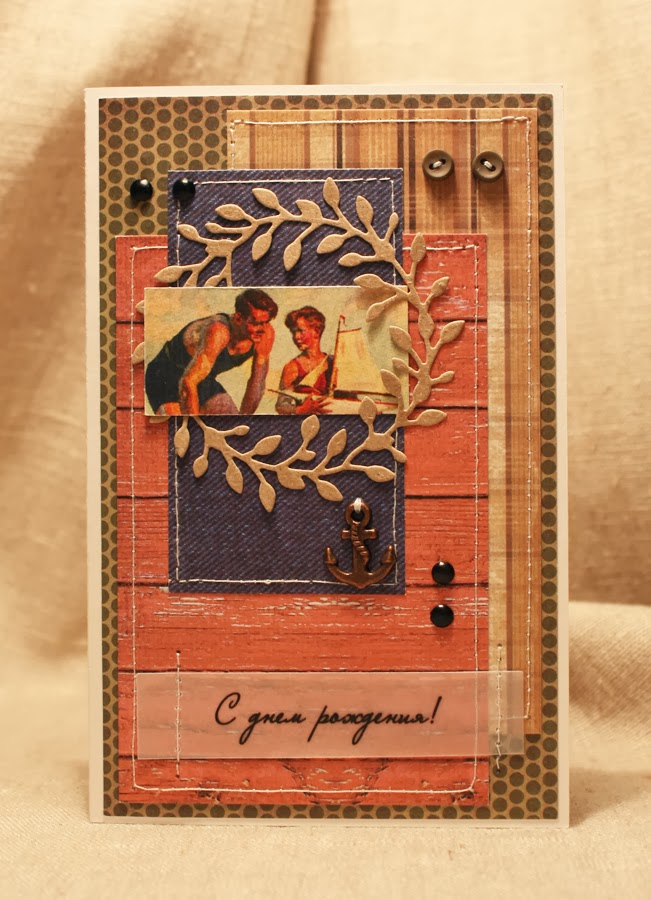 Основа - бумага для черчения, односторонняя и двусторонняя скрапбумага, высечки из крафт-бумаги "цифры" и "венок" (спасибо Татьяне-Breath), дыроколы круга (разных диаметров), распечатка на веллуме, пуговки, брадсы, подвеска-якорь, картинка - кусочек высечки graphic45 и, конечно, машинная строчка.